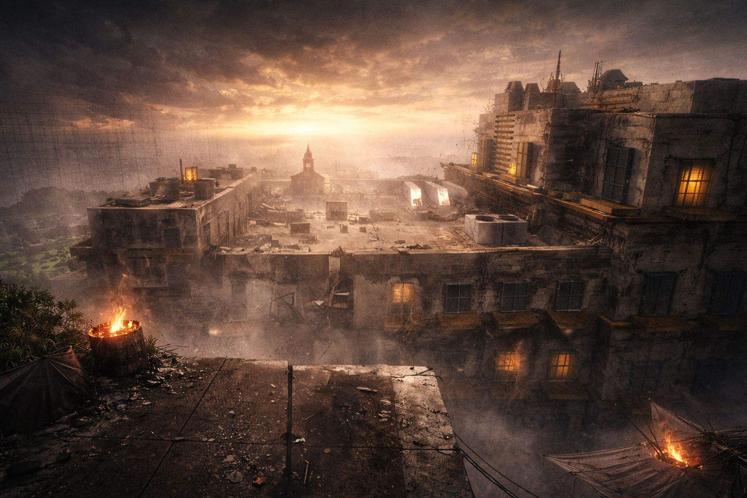 I focused on blocking off the edges of the camp site first, using a tunnel and a derailed train. Both structures aid with swift traversal into the city and give the player some height. ​​​​